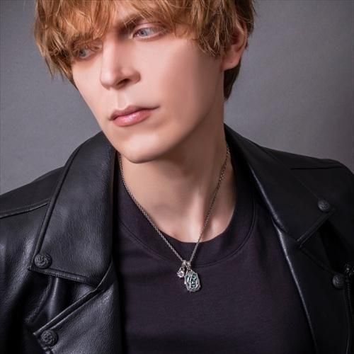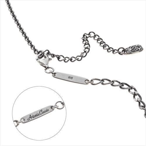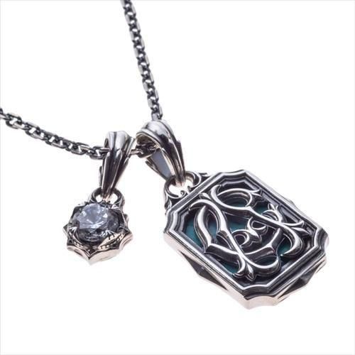 透かし彫りの「AC」ロゴにアマゾナイトカラーの大理石を重ねたトップと、Czクリア入りのイニシャルボールを組み合わせた2連ペンダント。人気の重ね着けデザインで、胸元に華やかさと立体感を演出します。トップ裏にもトレサリー模様の透かし彫りを施し、青緑色の石の透け感が魅力。ロゴ・ホールマーク・「925」刻印入り。チェーンは全長50cmでロング喜平と2種のアズキチェーンの3連ミックス。アジャスターで45-50cmまで調整可能。エンドにはACモノグラムチップ付き。