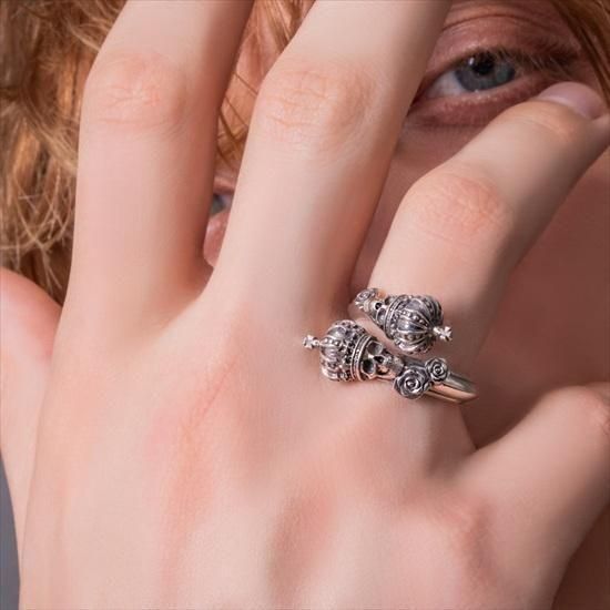 両端に配されたクラウンを戴く2つのスカルが指に絡みつくようなフリーサイズのスカルクラウンリング。緻密に彫刻された薔薇と王冠が、静かな存在感と気高さを宿す。リング内側には「Memento Mori(死を忘れるな)」のメッセージが刻まれ、"今を大切に生きろ"という力強い意志を伝える。ジュエリーライクな美しさとダークな精神性が融合したアートなリング。ブランドロゴとホールマーク、925刻印が確かな証となる、精巧な逸品。