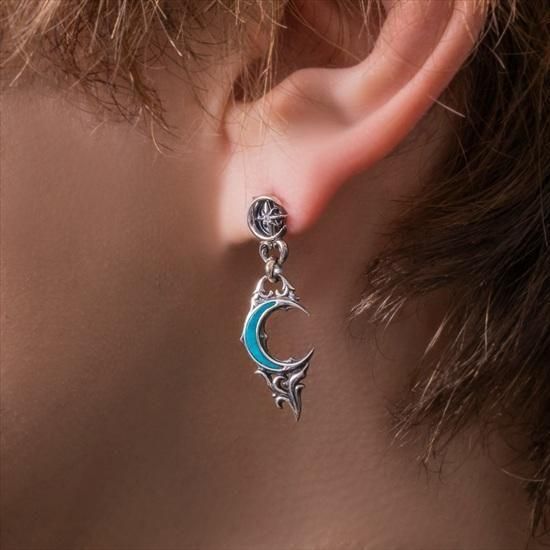 三日月モチーフは、トレサリー風のレイヤードデザインに仕上げられ、アマゾナイトカラーの染色大理石をセッティング。バチカンや下部の唐草模様も繊細に彫り込まれ、耳元に洗練された輝きを添えます。裏面にはブランドロゴ、925、3つのホールマークを刻印。さらに、シンセティックオニキスバージョンのピアスと組み合わせることで、ハート型を描くペアデザインに。同シリーズのペンダントと合わせれば、月の神秘が際立つコーディネートが完成します。揺れるたびに、ブルームーンの輝きが、あなたの耳元をそっと彩ります。